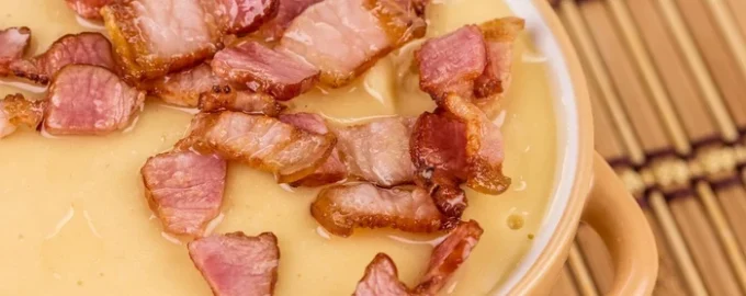 Bönasoppa med smält ost och bacon, tillagad mycket snabbt och enkelt, utan kokande buljong