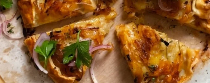 Denna potatistarte med karamelliserad lök och ost är en fest för smaklökarna. Den mjuka degen, den söta löken, den krämiga osten och den aromatiska timjan gör den mångsidig. Lägg till en lätt sallad för balans och njut av varje tugga.