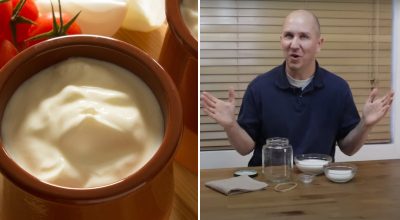 ”Ta nu en ren trasa och täck över burken med den. Fäst den med ett gummiband, garn, rep eller något liknande för att förhindra att den glider av. Låt burken stå i rumstemperatur i 24 timmar. När blandningen har tjocknat tar du bort duken. Du kommer att märka att den är tjock på toppen och lite vattnig på botten – den är skiktad. Detta är helt normalt. Ta bara en stor sked och blanda allt tills det är jämnt. Överför det sedan till en behållare. Din tjocka hemgjorda gräddfil är klar”, säger Matt.